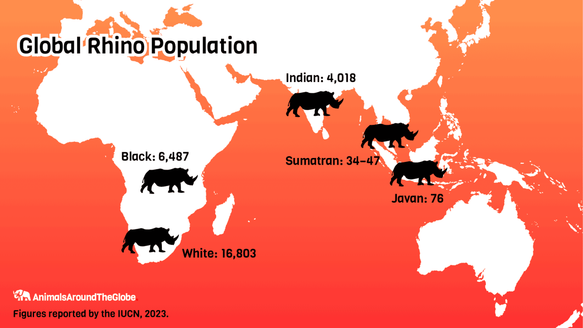 Javan rhinos (Rhinoceros sondaicus) used to inhabit much of southern Asia. Today, with only 76 alive, their range is within one nationally-protected area, called Ujung Kulon National Park, located in Java, Indonesia. In 2023, Indonesian authorities captured two gangs of poachers who confessed to poaching 26 Javan rhinos over the preceding 4 years.