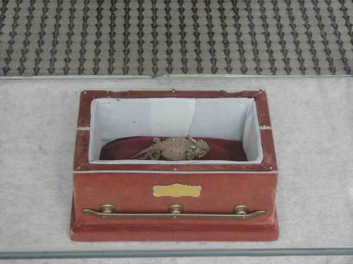 Around that time, in 1897, a time capsule was to be placed inside a newly built courthouse in the county. Wood decided to test the theory and suggested placing the horned lizard inside the keystone capsule.